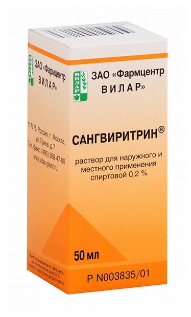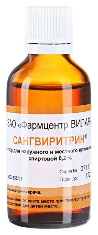 | Состав | Действующее вещество:Сангвиритрин - 2,0 г (сангвинарина гидросульфат + хелеритрина гидросульфат) (в пересчете на 100 % вещество)Вспомогательные вещества: спирт этиловый (этанол) 95 %, вода очищенная -до 1000 мл препарата. |