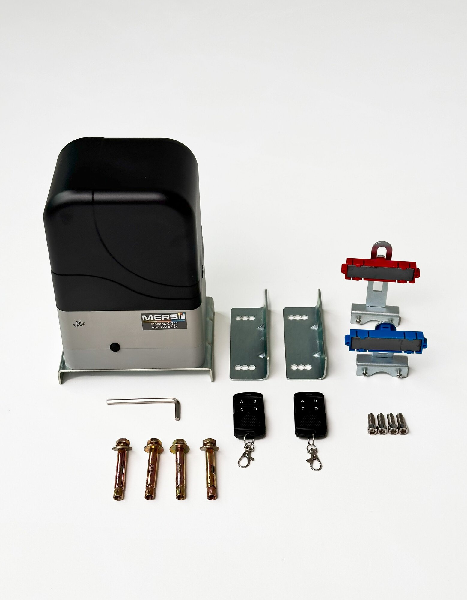 | Подробная комплектация | Привод MERSIII C-300 -1 шт. Запрограммированные 4-х канальные пульты- 2 шт. Набор крепежей- 1 шт. Магнитные концевые выключатели - 2 шт. Инструкция |