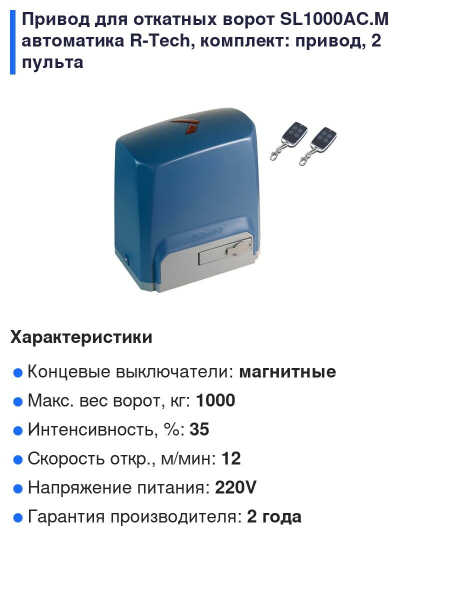 Привод для откатных ворот SL1000AC.M автоматика R-Tech, комплект: привод, 2 пульта интересное:
