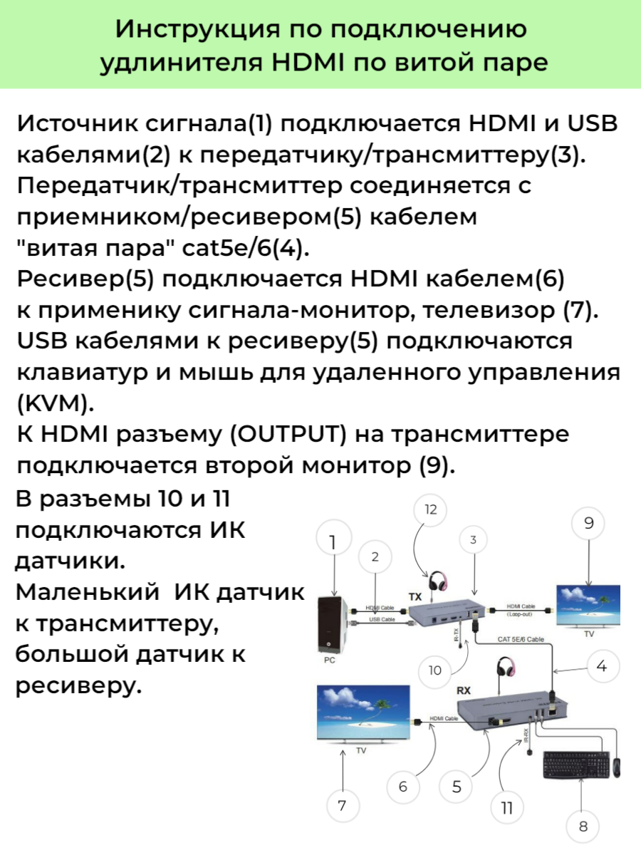| Дополнительная информация | Поддерживает разрешения экрана до 4K x 2K@30 Гц, 1080P@60 Гц и 3D@60Hz. KVM управление. В комплектации идут ИК датчики сигнала для дистанционного управления. Поддерживает протокола HDCP 1.4. Функция Local Loop - наличие дополнительного HDMI выхода. Передатчик и Приемник имеют аудио выход 3,5мм стерео для подключения колонок или наушников. |
