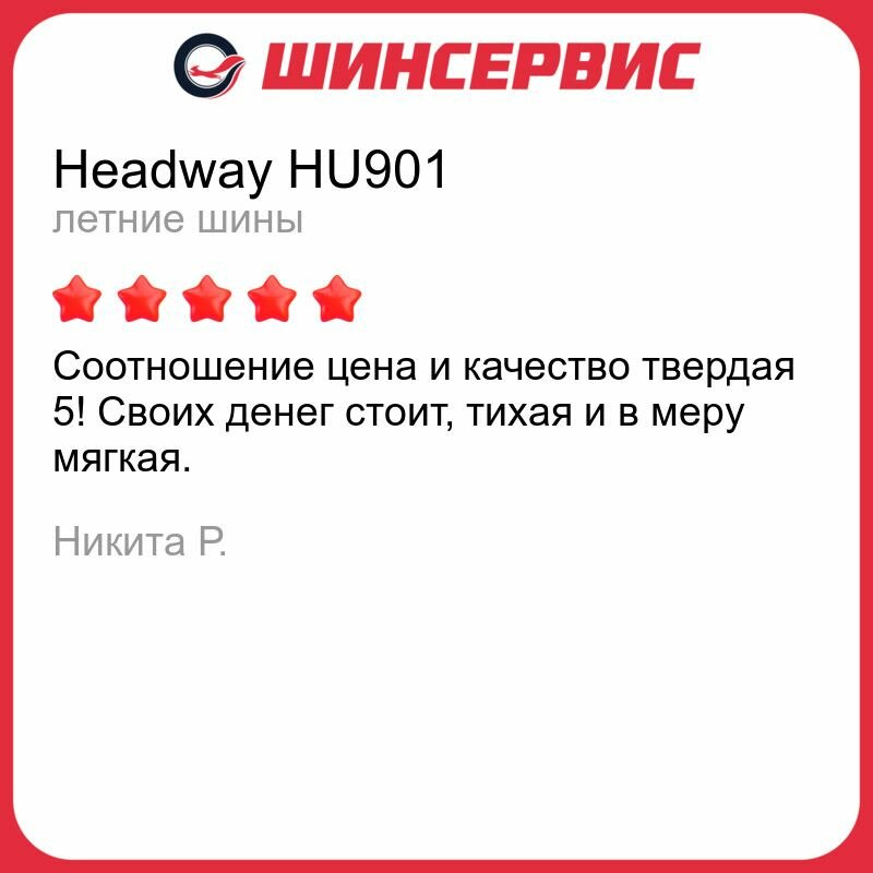 За время пользования резиной Headway HU901 - она проявила себя довольно благоприятно. Порадовала хорошим тормозным путем. Во время дождя не скользит, как это делают многие аналоги. Не замечал, что бы на поворотах заносило. Хорошо слушается руль. То есть резина действительно хорошая, особенно для городской дороги. Довольно мягкая, что позволяет избежать сильной чувствительности всяческих камней и кочек. Это очень помогает при выезде из города. Но конечно, что спорить, для города подходит намного лучше. И сама по себе лучше многих представителей - аналогов из стран востока |