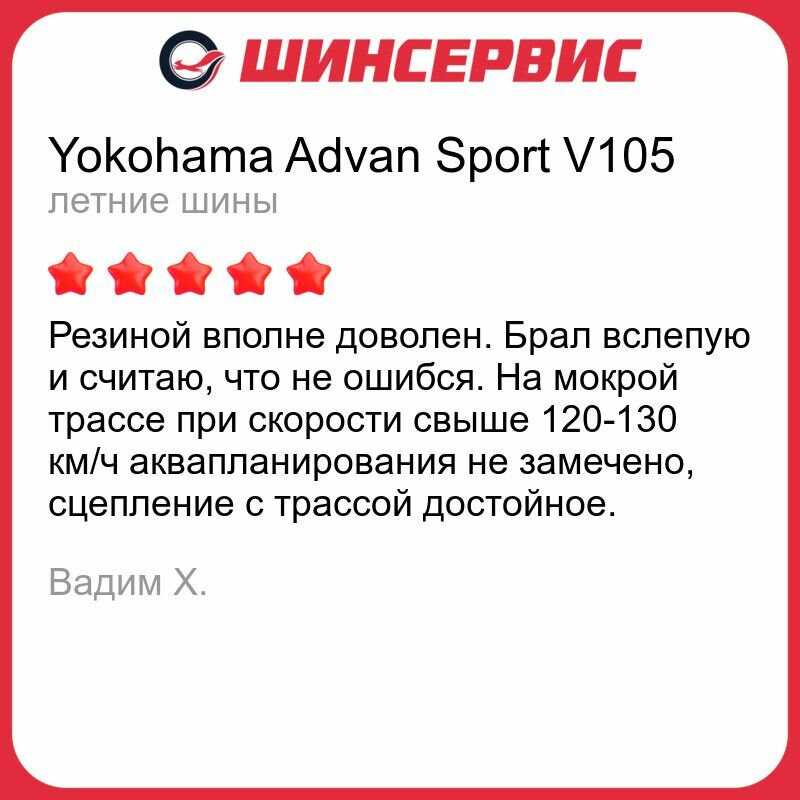 Очень доволен резиной, своих денег стоит. Как альтернативу рассматривал Michelin Pilot Super Sport, они близки по характеристикам. Взял Yokohama Advan Sport v105 и выбором доволен на 100%. Проехал 1 сезон в режиме 200+ км/ч каждый день (езжу далеко по трассе) - полет нормальный, на больших скоростях рулится отлично, отзывчивость на высоте, на неровностях по зубам не бьет (мягче, чем R18 RunFlat Pirelli 225/45 255/40). Откатал на ней весь октябрь. При нулевых температурах и небольшом морозе не дубела, тормозит отлично, что удивило. Резиной очень доволен, категорически рекомендую для спортивных машин и больших скоростей. |