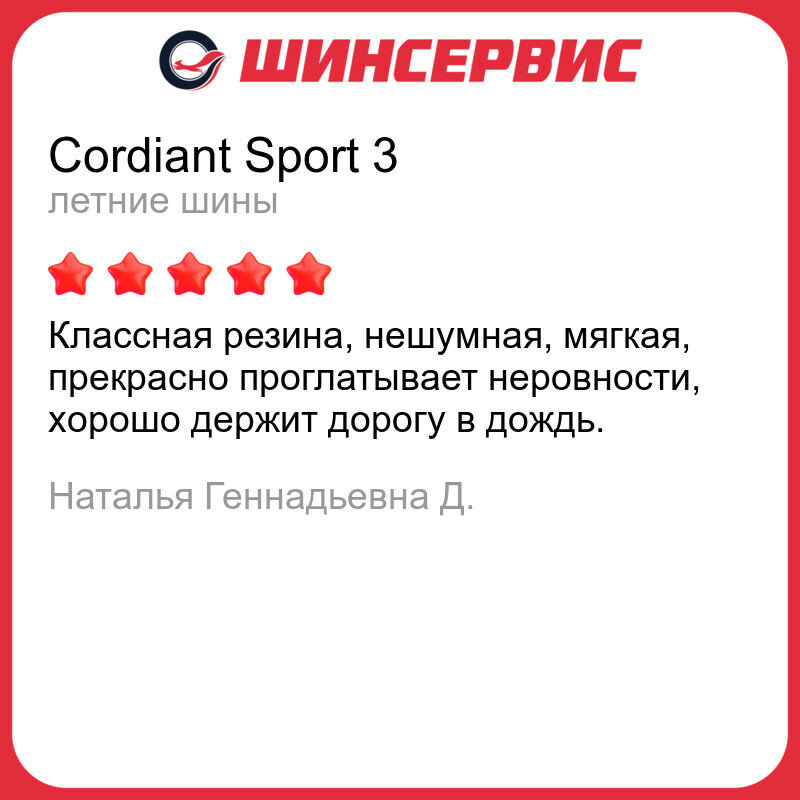 | Отзыв: | Последние несколько лет ездил на Nokian, Continental. Решил заплатить поменьше денег и на Пежо 308 прикупил R15 от Cordiant Sport 3. Впечатления самые положительные: нешумная, прекрасно входить в поворот на скорости, в целом управление очень достойное. Пока не было дождя чуть позже обновлю отзыв и поделюсь впечатлениями о мокрой погоде, но по ощущениям все будет О.К.