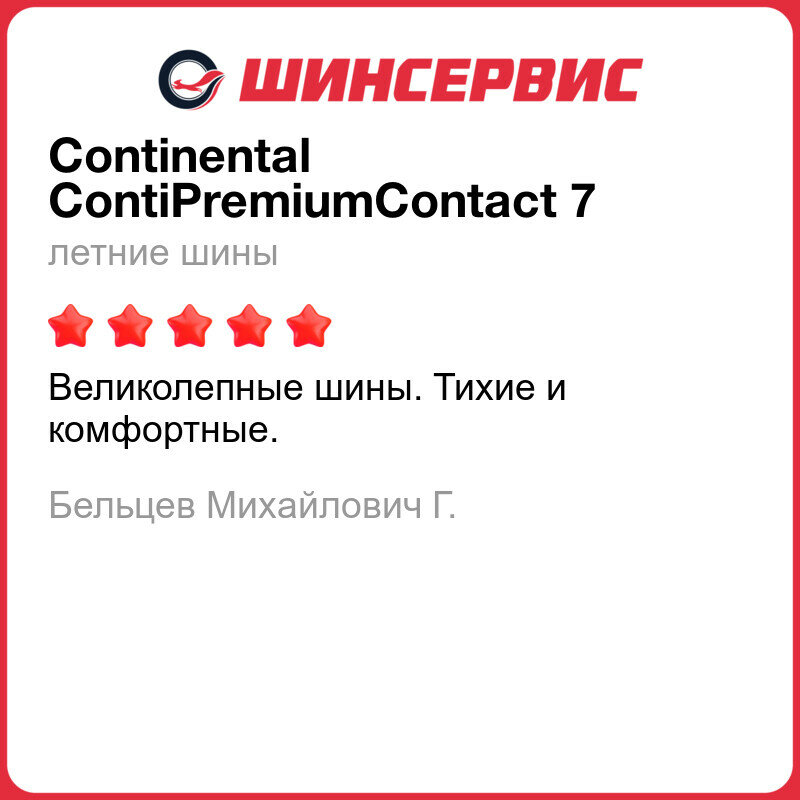 | Отзыв: | Купил летом новые шины. Приятно удивили низким уровнем шума и мягкостью прохождения неровностей на дороге. Хорошо держат дорогу на сухом асфальте и в дождь. |
