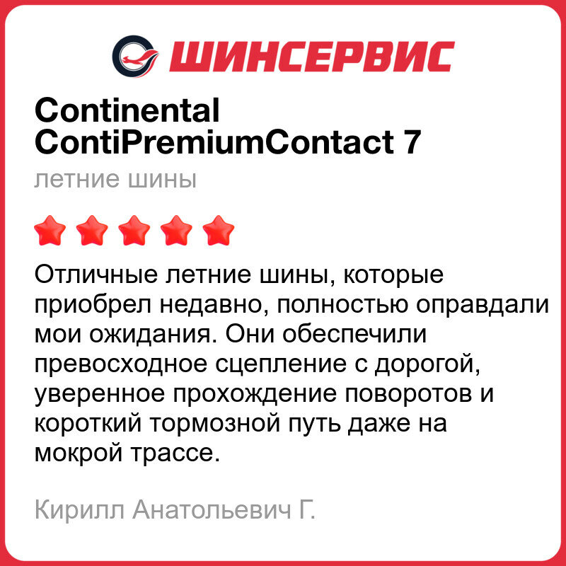 | Отзыв: | Отменная резина, в жару, в дождь в любую погоду (кроме зимы конечно) отлично себя ведет. жестковата, немного, но не критично.