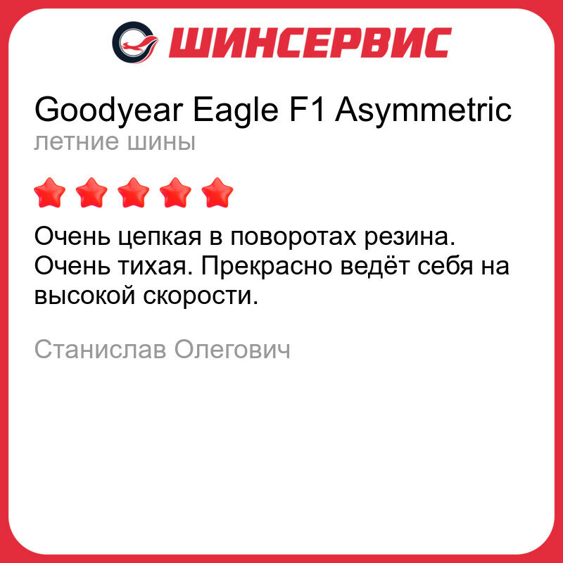 | Отзыв: | В очередной раз убеждаюсь в отличном качесте шин Гудиер. Езжу на этой марке с 2002 года. Самое потрясающее это то, что гудиеров всегда хватает на 4-5 сезонов. И так, после использования всех возможных гудиеров Gripov, шины Игл ф1 - это небо и земля. Торможение просто великолепно отрабатывают, там где раньше срабатывала АБС-ка, иглы плавно останавливают машину. В дождь полная уверенность управления и торможения, не кидают, не заносят, этого ничего нет, если конечно не крутить двигатель до предела. Всем советую приобрести Игл ф1 и убедиться самим лично в качестве и надежности данных шин |