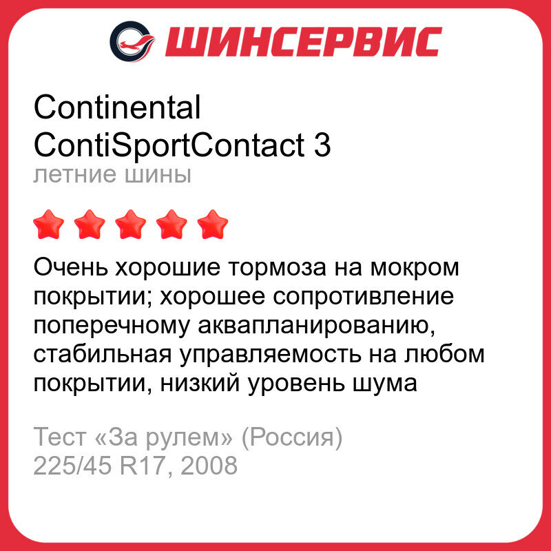 Резина очень радует тем как держит в поворотах. Когда только купил машину (а потом и резину) и хвастался друзьям, то зашел в почти 90-градусный поворот на скорости 75 км/ч. Обос...испугались все, резина лишь немного взвизгнула, даже не дав сработать системе стабилизации. Поведение в дождь тоже предсказуемо, при попадании в лужу одной стороной руль не вырывает, машина начинает плавно терять скорость и сползать в сторону. При этом же при езде по мокрой колее машина не едет - плывет. Вроде и реагирует на все действия штатно, но чувствуется, что зацепа почти нет. Короче колея в дождь - минус этой резины. Равно как и шумность. Это просто что-то с чем-то. На скорости 100 км/ч приходится разговаривать на повышенных тонах. Резина очень шумная. Прям до раздражения. Но это в России. Много ездил по Европе, и на их безгравийном асфальте на скорость 180 км/ч слышно как мирно сопит спящий на заднем сидении попутчик. Как и любого владельца S-Tronic (DSG7, DQ200) меня очень волнует живучесть сцеплений. Так вот при резком старте резина не редко буксует, что негативно сказывается на ресурсе сцепы. Есть ContiSportContact 5 на заднеприводном Мерседесе - разница в деталях. Новая модель чуть тише, чуть точнее рулится и так далее. Стоит ли это "чуть" переплаты решать вам. Мне предложили новый комплект этих контиков по очень хорошей цене, поэтому взял не задумываясь. Пришлось бы выбирать - скорее взял бы 5 поколение. P.S. Кстати ContiSeal работает. На третий день после установки новой резины поймал саморез, через пару дней он сам вывалился. Давление держит, на шиномонтажку так и не поехал. |