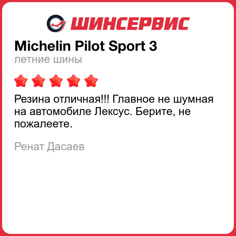 | Плюсы: | Купил взамен michelin energy saver форд фокус3. Очень доволен, что заменил и не зря потратил деньги! Долго выбирал между примаси и континенталем... Шикарно держит авто на скорости до и более 120-140 км, меньше стал ощущать скорость, ездить быстрее, курсовая устойчивость на высоте, управление напорядок лучше! Заметно потише стало в салоне, даже с непроклеянными арками колес, мало шумные, легкое не напрягающее шуршанье от грубого асфальтового покрытия, гула никакого не замечал на разных скоростях, по тем же дорогам - на мой взгляд потише в салоне стало! С родными мишлен энерджи север были вибрации по салону и чуть по рулю после 115-120 км/ч- специально проверял до покупки резины лазерной балансировкой все четко отбалансировано на стенде, думал с подвеской проблемы, однако после установки данных новых шин(пилот спорт3) на те же диски - вибрации по салону пропали, балансировка та же лазерная!!! Нежесткая, как некоторые могут подумать, что спорт, мягко и очень нравится по комфорту! В дождливую погоду ведет себя нормально, торможение хорошее. |