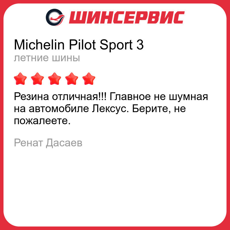| Плюсы: | Купил взамен michelin energy saver форд фокус3. Очень доволен, что заменил и не зря потратил деньги! Долго выбирал между примаси и континенталем... Шикарно держит авто на скорости до и более 120-140 км, меньше стал ощущать скорость, ездить быстрее, курсовая устойчивость на высоте, управление напорядок лучше! Заметно потише стало в салоне, даже с непроклеянными арками колес, мало шумные, легкое не напрягающее шуршанье от грубого асфальтового покрытия, гула никакого не замечал на разных скоростях, по тем же дорогам - на мой взгляд потише в салоне стало! С родными мишлен энерджи север были вибрации по салону и чуть по рулю после 115-120 км/ч- специально проверял до покупки резины лазерной балансировкой все четко отбалансировано на стенде, думал с подвеской проблемы, однако после установки данных новых шин(пилот спорт3) на те же диски - вибрации по салону пропали, балансировка та же лазерная!!! Нежесткая, как некоторые могут подумать, что спорт, мягко и очень нравится по комфорту! В дождливую погоду ведет себя нормально, торможение хорошее. |