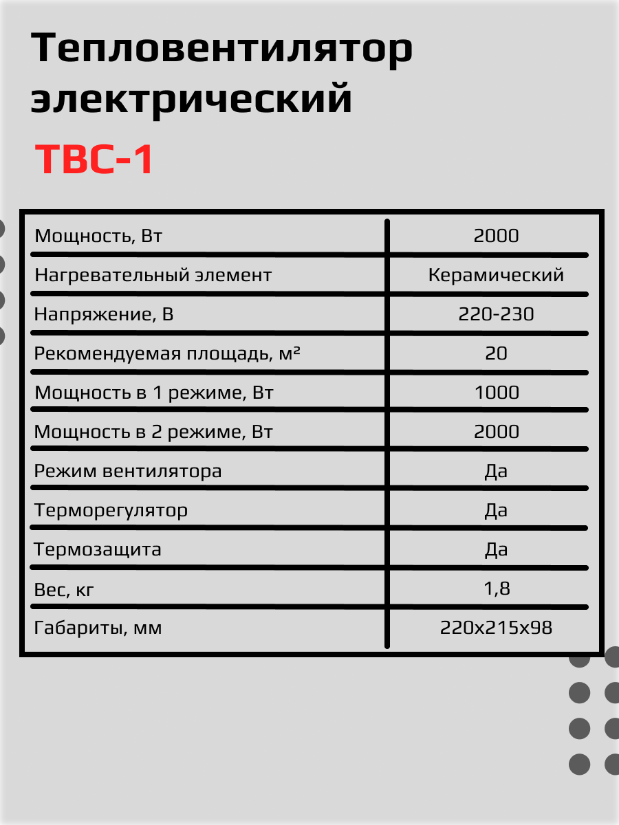 Тепловентилятор РЕСАНТА ТВС-1, 2 кВт, до 20м2, спиральный нагревательный элемент интересное: