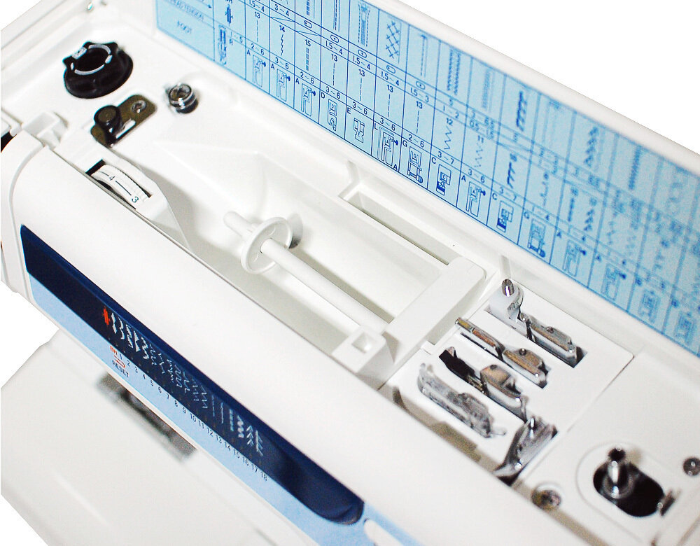 Шью много и разные ткани. Прошивает и толстые ткани(драп,подгиб низа джинсов-9 слоёв), и тонкие ткани, трикотаж(качество строчек зависит от правильности настроек натяжения нити). Шила кожу. Лучше использовать специальные лапки и иглы для разных тканей,они продаются в специализированных магазинах. В корпусе (сверху)расположены ячейки для лапок (их 7 шт + ещё одна лапка для вымётывания петель),на крышке -"швейный советник" с подсказками по настройкам длины, ширины и выбору лапки для каждой строчки(очень удобно для новичков). Машина хорошая. |