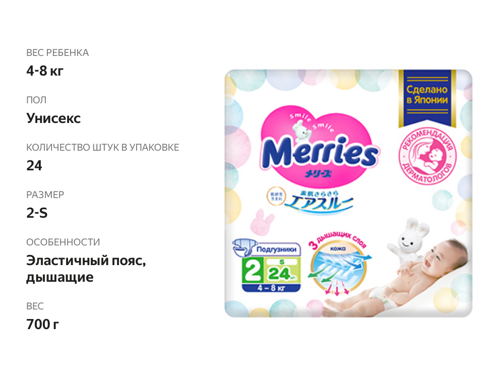 СохранитьПодгузники Merries для детей размер S 4-8 кг 24 шт интересное: