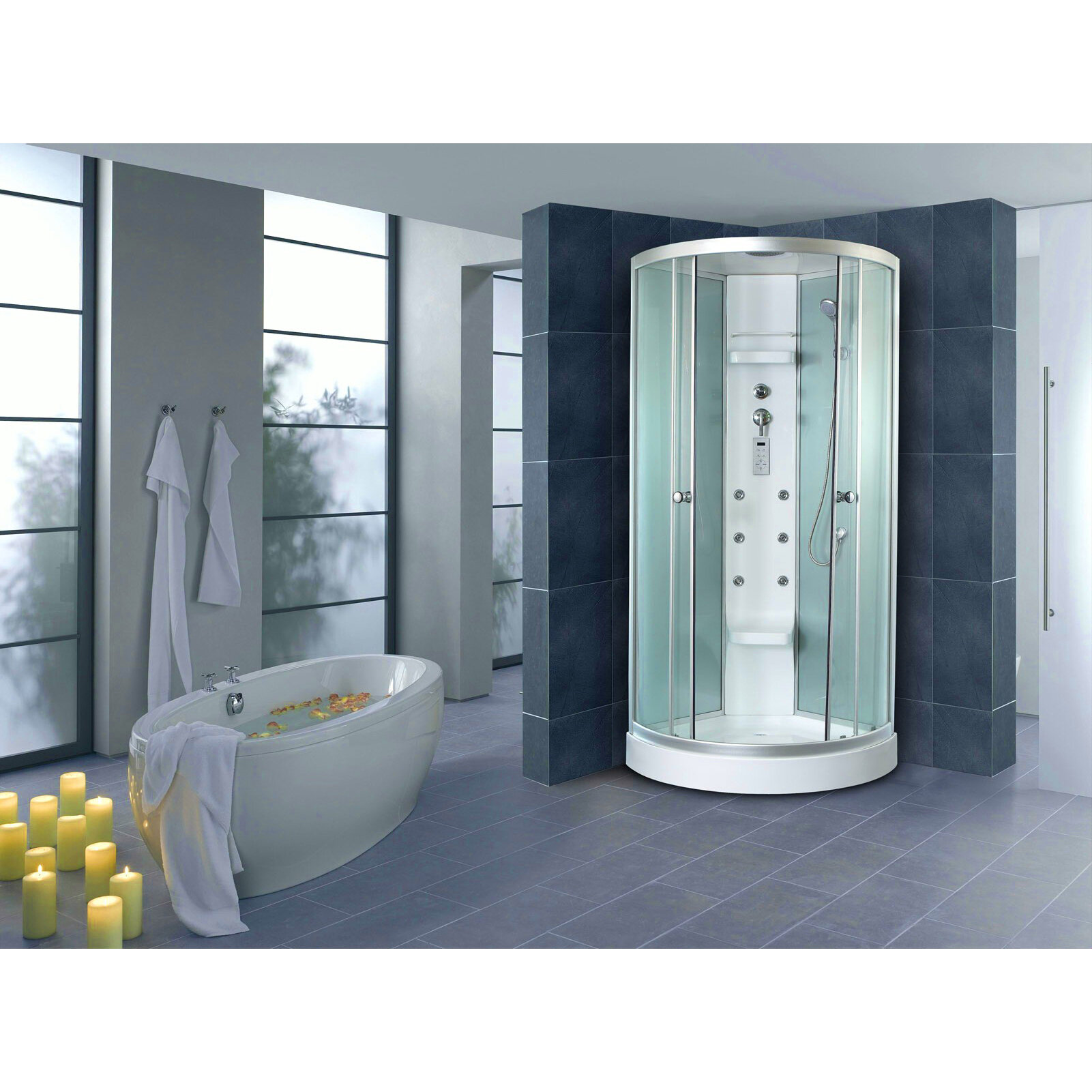 Все стандартные наполнения в этой кабине есть: тропический душ, гидромассаж, радио, электронная панель управления. |