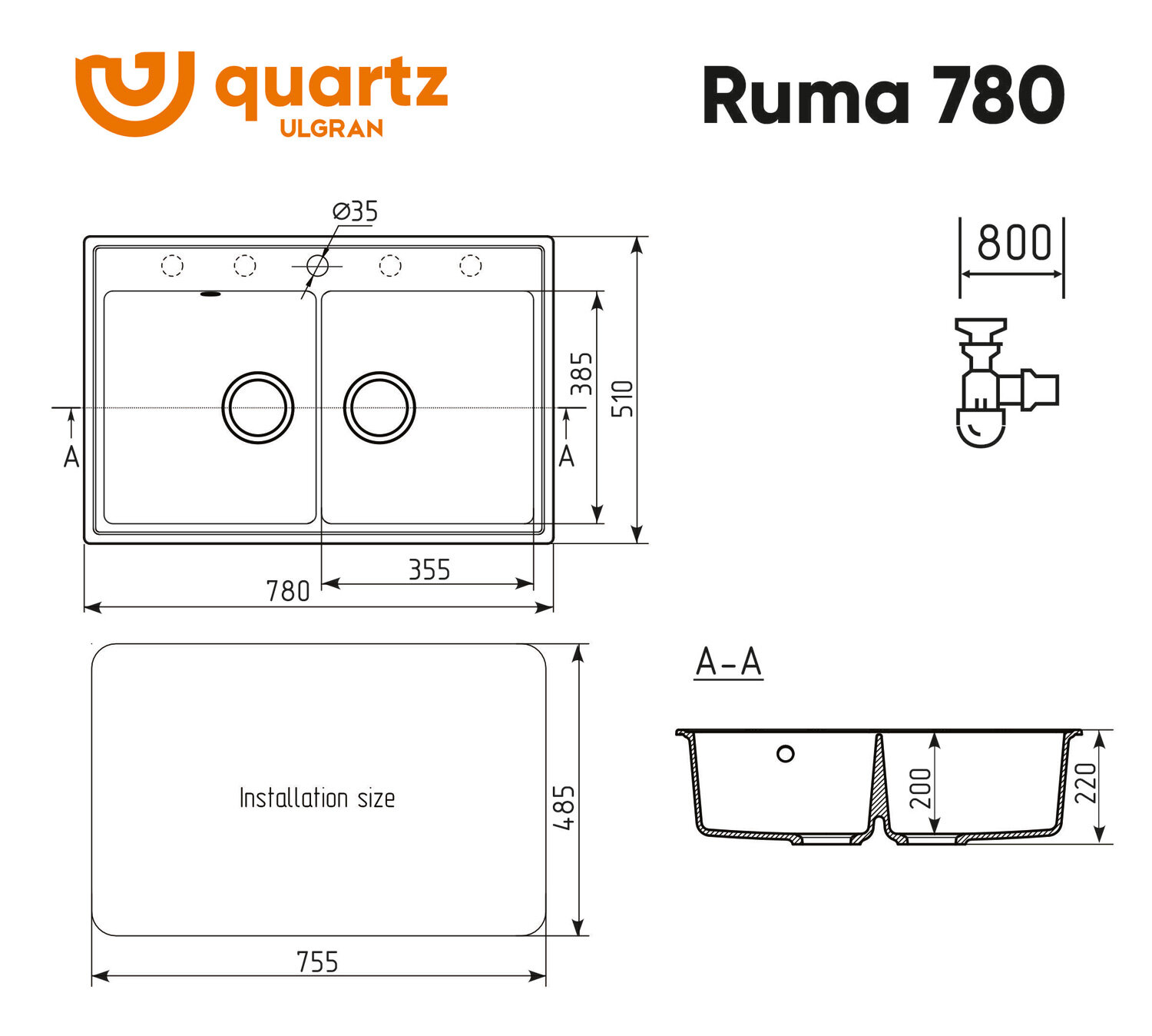Мойка кухонная Ulgran из кварцевого композита прямоугольная Quartz Ruma, цвет: космос, база: 75.5х48.5 см, арт. Ruma 780-08