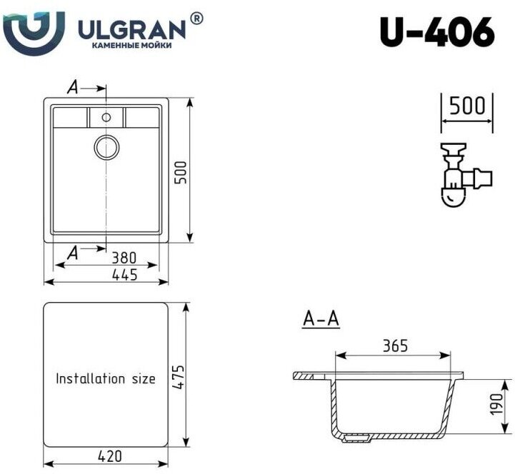 Мойка кухонная Ulgran из искусственного мрамора квадратная U-406, цвет: черный, база: 42х47.5 см, арт. U-406-308