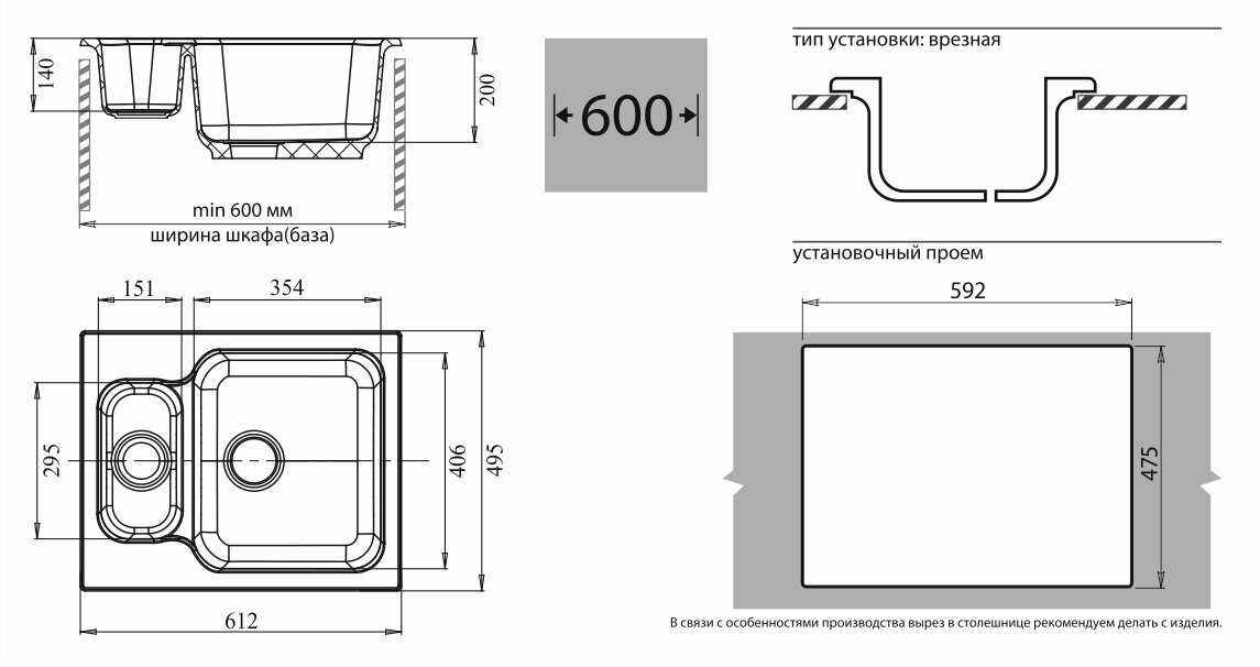 Мойка кухонная GranFest STANDART GF-S-615K 1.5-чаши 612*495 мм графит, мрамор