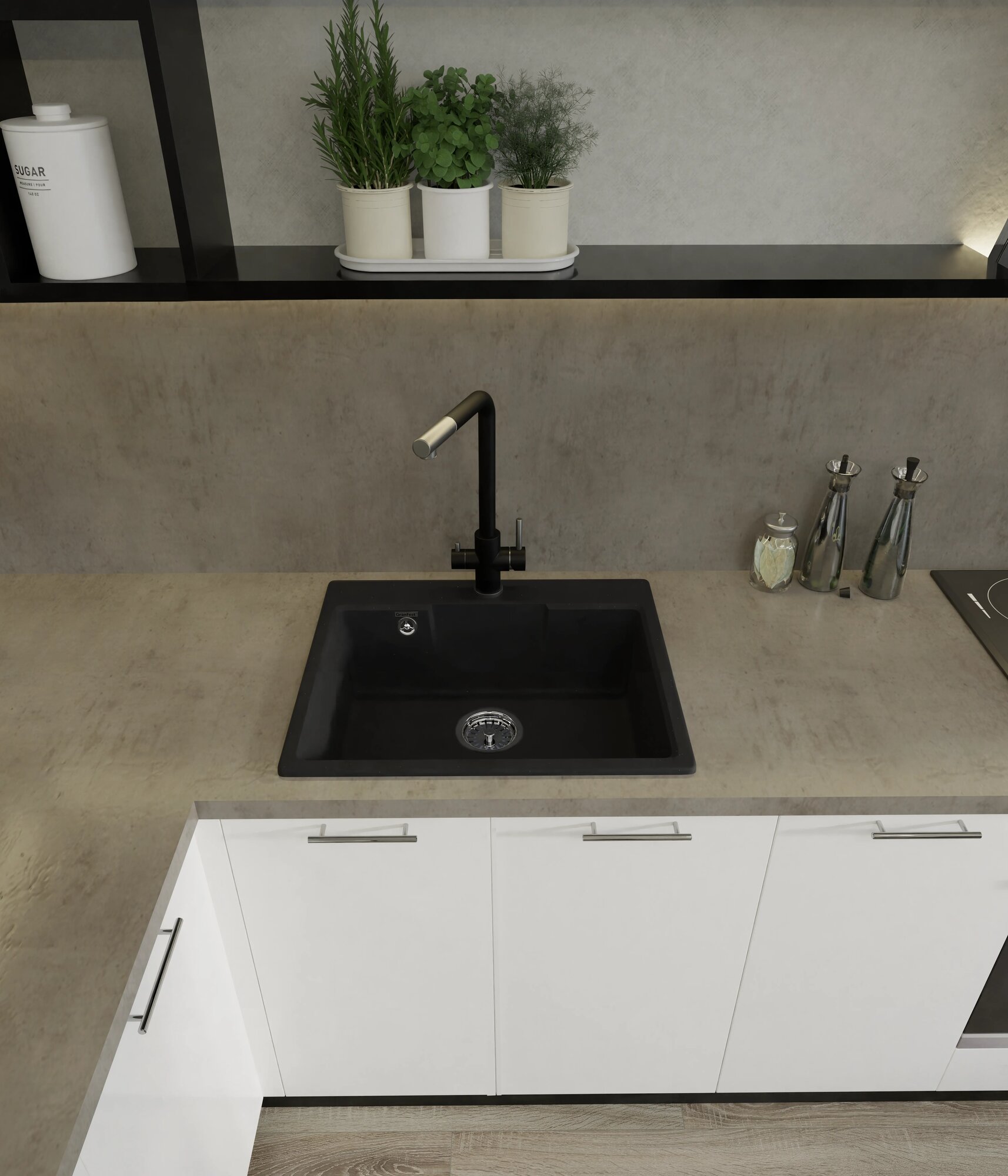 Мойка кухонная врезная, GranFest, Urban, кварцевый песок, 580х490 мм, одна чаша, черная, GF-UR-658