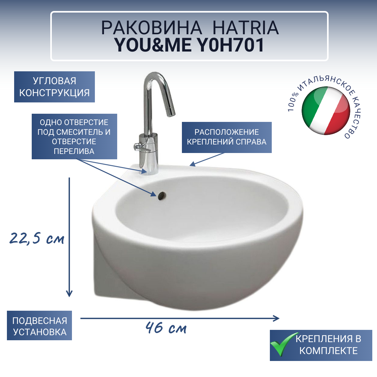 Купить Раковина подвесная угловая HATRIA YOU&ME Y0H701, с 1 отверстием под смеситель, без донного клапана