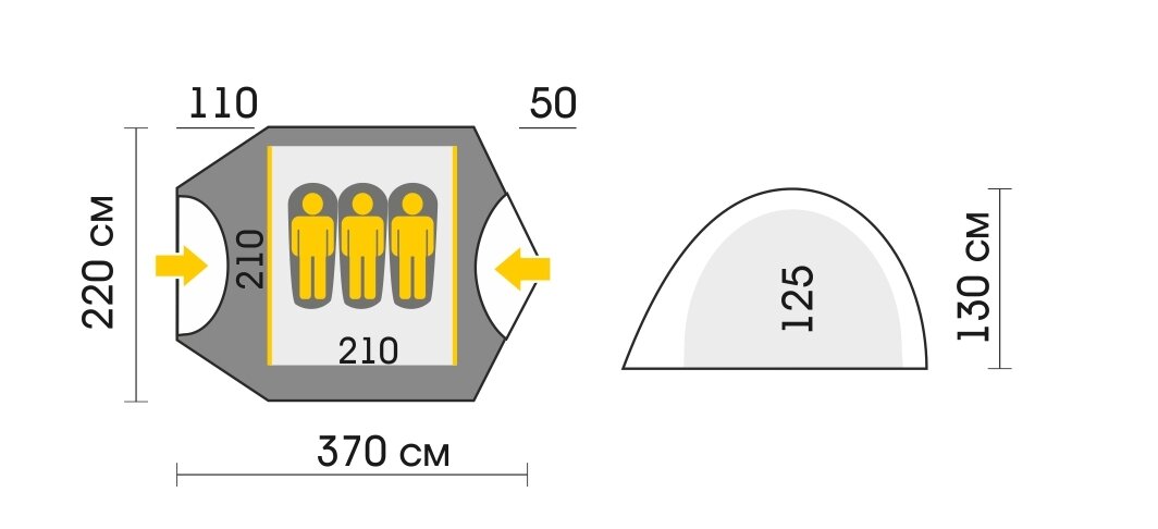 Места много, тамбуры вместительные. Спал один, много с собой было барахла (охотник). В первый же выезд выдержала очень крепкий ветер, порядка 18 м/с (по предупреждению МЧС). Была установлена на 2 набора колышек, за все растяжки, поэтому устояла. Кренилась под 45 градусов, но дуги выдержали. Юбка рулит (а если к ней пришить еще несколько петель...)!!! Ничего не протекло. Под палаткой застелил толстую черную пленку, чтобы не продрать дно и облагородить тамбуры. Вентиляция нормальная. К качеству материалов пока претензий нет, так как был единственный выезд. |