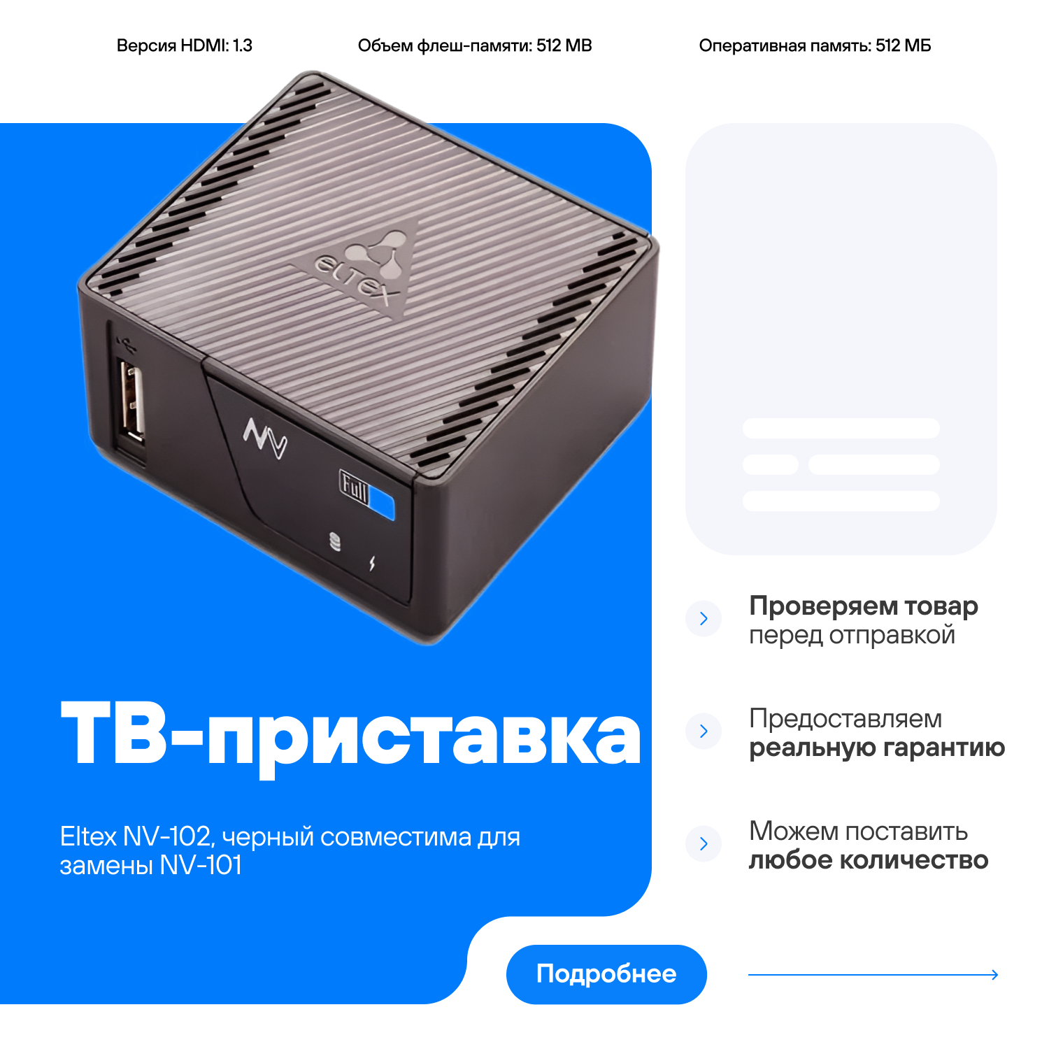 Ниже Вы можете прочитать отзывы на ТВ-приставка Eltex NV-102 512 МБ, ознакомится с подробными характеристиками, посмотреть интересные обзоры и фотографии на ТВ-приставка Eltex NV-102 512 МБ.