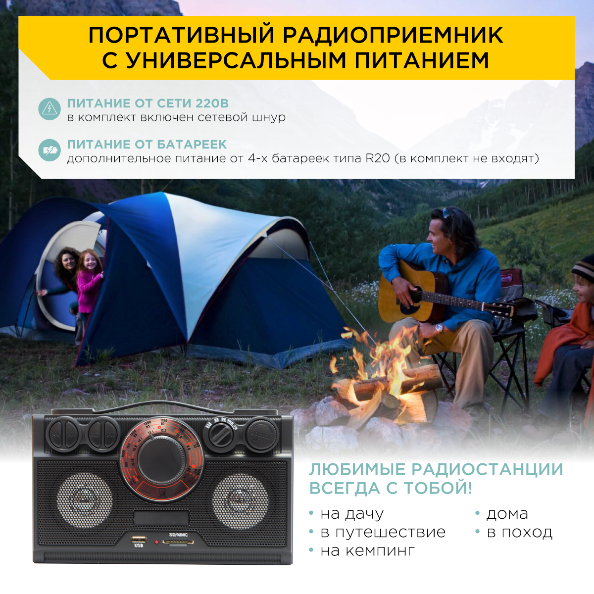 БЗРП РП-304 УКВ 64-108МГц, бат. 4*R20, 220V, USB/SD, 2 динамика