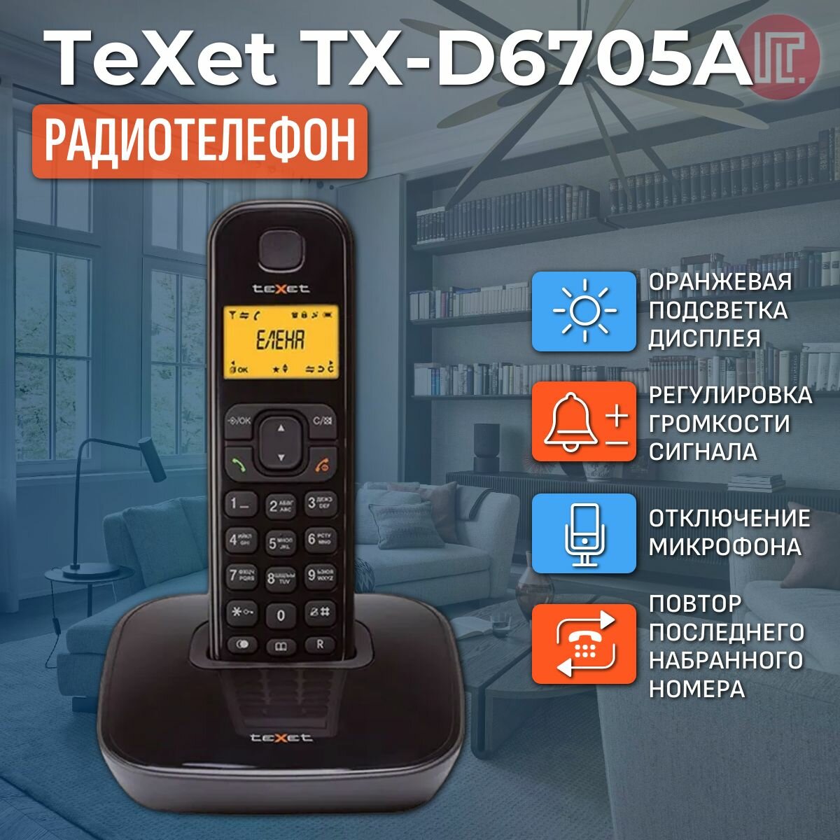 Телефон беспроводной Texet TX-D6705A, АОН, 20 номеров, черный, 344179