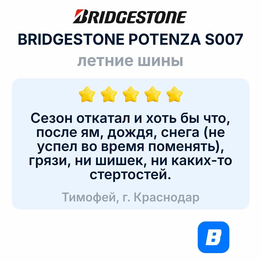 | Отзыв: | Замечательный топчик от бриджа, как то по дождику пришлось оттормаживаться в пол, до полной остоновки, шины справились на все сто, машину не потянуло ни влево, ни вправо, остановился метра за 3 до неожиданно выскочившего на главную дедули, чего нельзя сказать о мерсе, который меня и догнал))) Катятся очень легко, износ за 25тыс. минимальный. |
