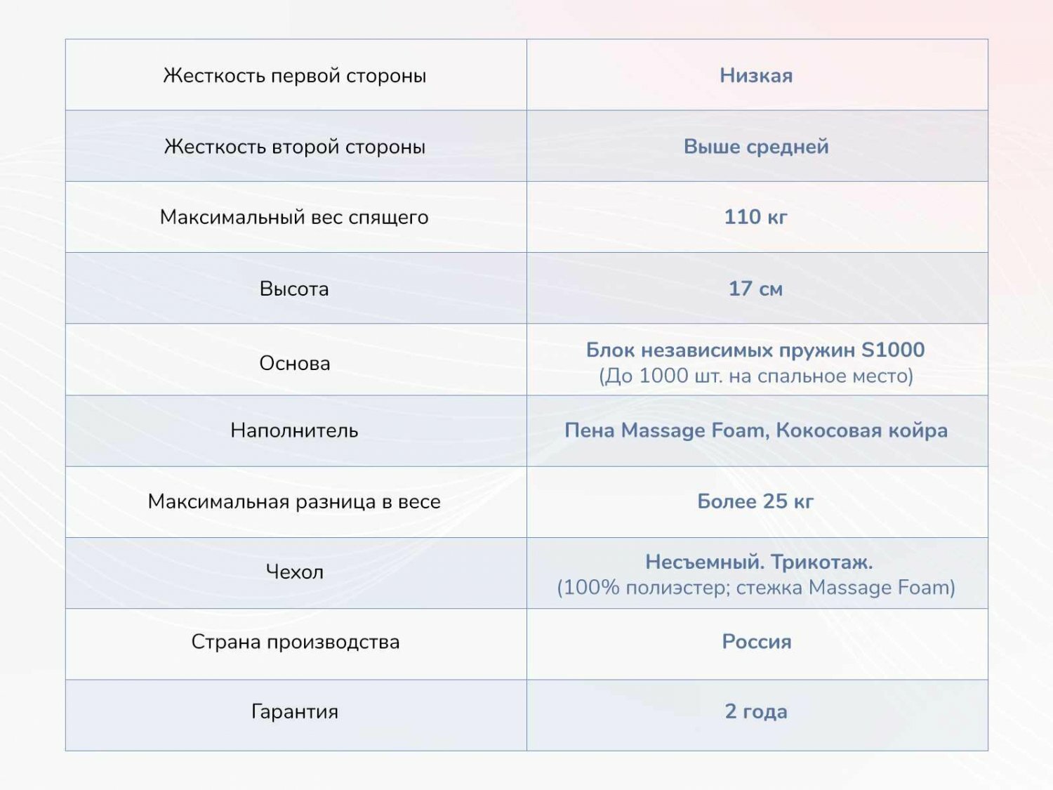Матрас имеет независимые пружинные блоки, что делает его безшумным, долговечным. Натуральные наполнители позволяют телу дышать и обладают ортопедическими свойствами. Ткань поверхности очень приятная. Имеет 2 уровня жесткости-средняя и выше среднего. Матрас доставили до дверей в свернутом виде, после распаковки принял нормальную форму в течении 3 часов. Матрас действительно комфортный и удобный. Первая ночь доказала это, спала как ангел, проснулась без боли в спине, чего давно не было в связи со сколиозом и межпозвоночными грыжами. Спасибо за отзывы, которые помогли мне в выборе и производителю за мой крепкий сон теперь! Теперь надо искать подушку) |