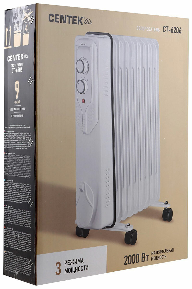 СохранитьОбогреватель электрический масляный CENTEK CT-6206: белый, 9 секций, 20м2, 2000Вт, 3 режима, защита от перегрева, терморегулятор, LED-индикатор интересное: