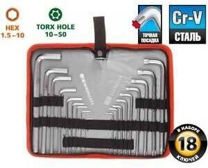 Набор ключей имбусовых ЗУБР "Мастер"Cr-V,нейлон чехол,HEX 1,5-10 мм длинные 9 шт,TORX Т10-Т50 длинные 9 шт(27463-H18)