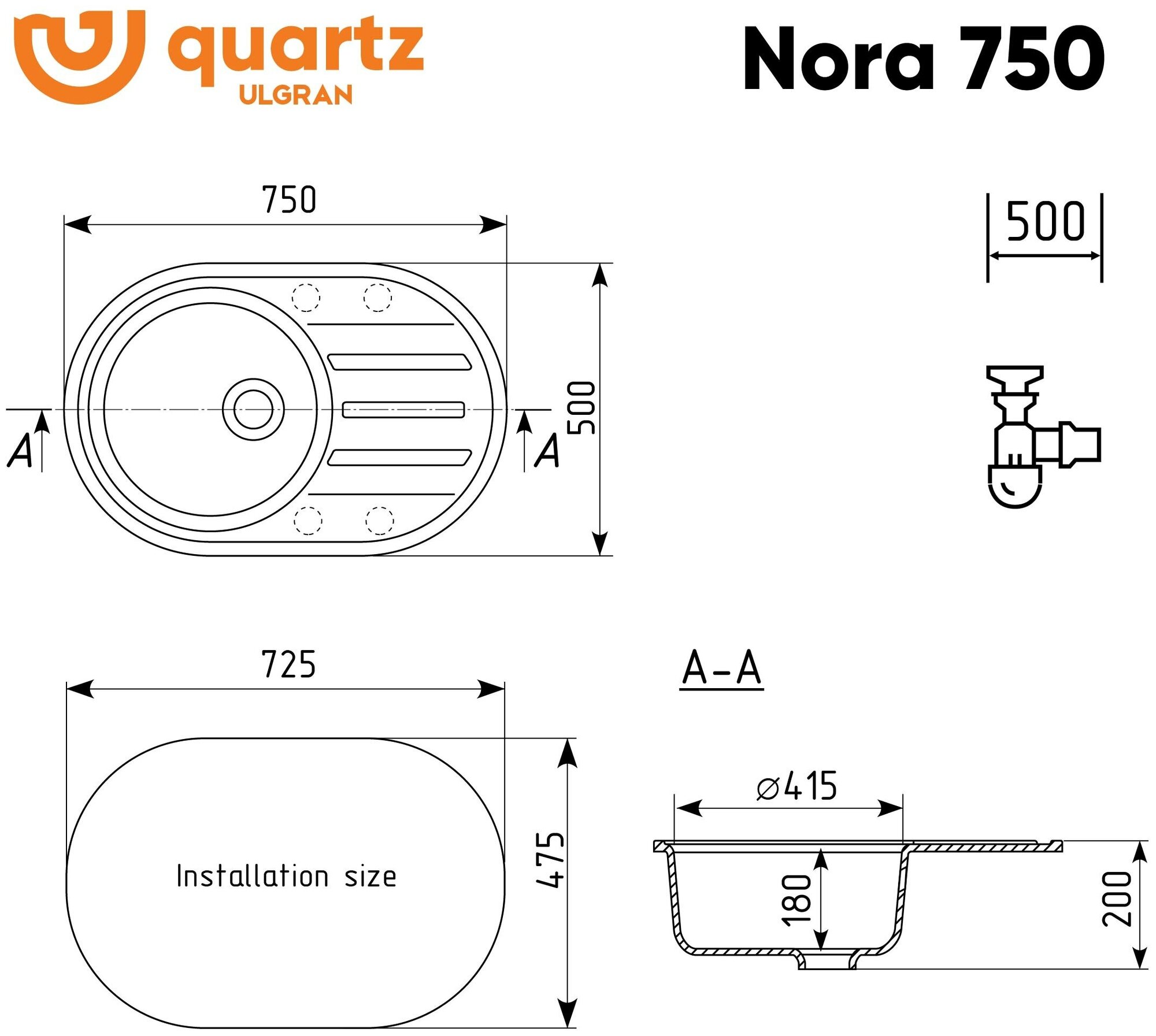 Мойка кухонная Ulgran из кварцевого композита овальная Quartz Nora, цвет: уголь, база: 72.5х47.5 см, арт. Nora 750-07