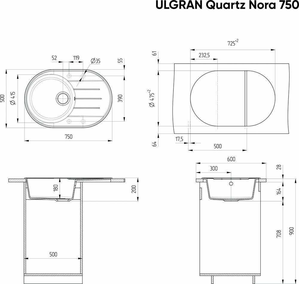 Мойка для кухни кварцевая Ulgran Quartz Nora 750-07, уголь