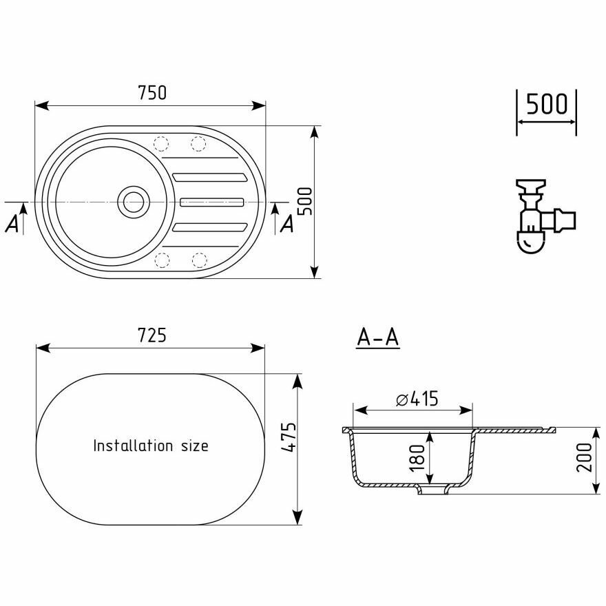 Мойка кухонная мраморная ULGRAN U-500 440мм круглая (308) черный/Раковина для кухни
