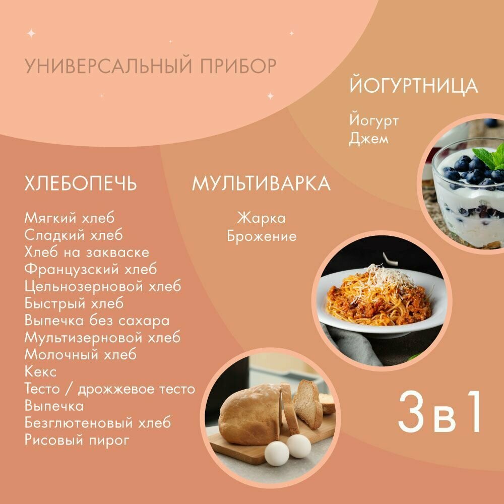| Программы | безглютеновая выпечка / бездрожжевая выпечка / бородинский хлеб / варенье / замес теста / йогурт / кекс / пшеничный хлеб / ржаной хлеб / сладкая выпечка / французский багет / хлеб из муки грубого помола / тесто для вареников / тесто для мант / тесто для пельменей |