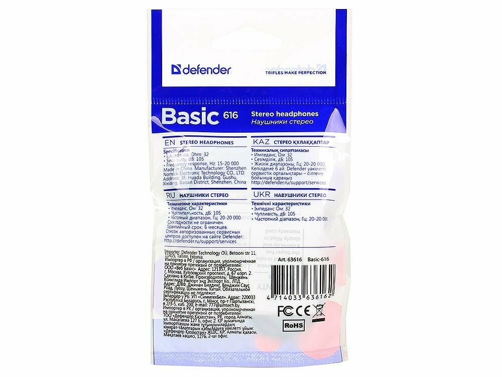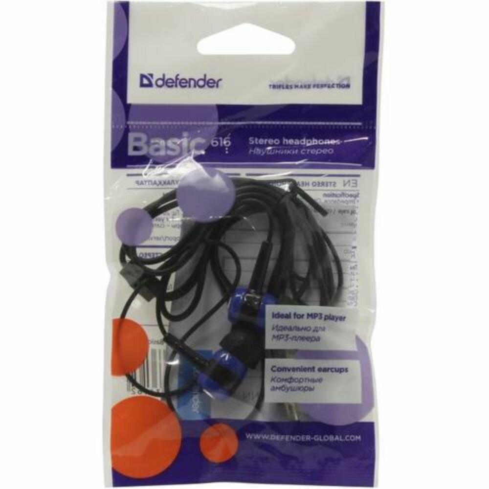 Наушники-вкладыши Defender Basic 616, 1,1м, черный, синий ( Артикул 260511 )