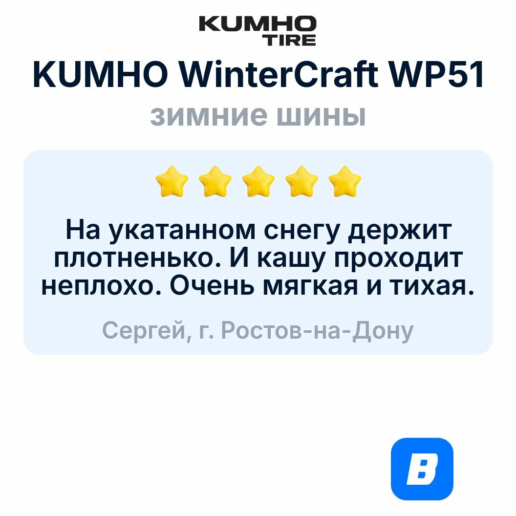 | Плюсы: | Шины зимние Kumho WinterCraft WP51 195/65/R15 купил недавно. Машина легко управляема,стабильна в поворотах. Пока не знаю как везти себе будет на льду. |