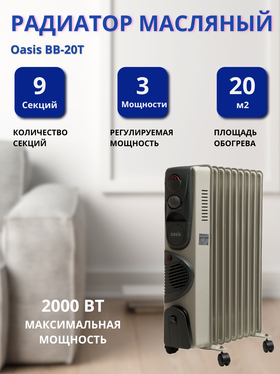 Масляный обогреватель Oasis BB-20Т, 9 секций, 2 кВт, 20 м²