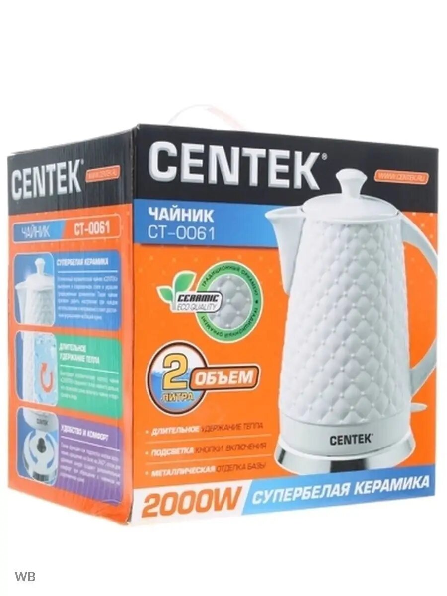 СохранитьЧайник электрический CENTEK CT-0061 White - 2.0 л/ 2000 Вт/ супербелая керамика/ рельефный корпус интересное: