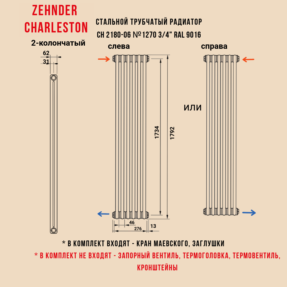 Радиатор трубчатый Zehnder Charleston 2180 1792 с боковой подводкой 3/4, кол-во секций: 10, 12.44 м2, 1244 Вт, 460 мм.