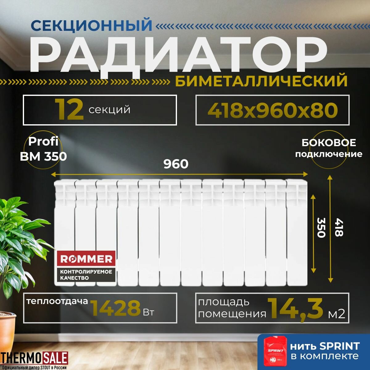 Радиатор секционный биметаллический Profi BM 350 12 секций параметры 418х960х80 боковое подключение Сантехническая нить 20 м
