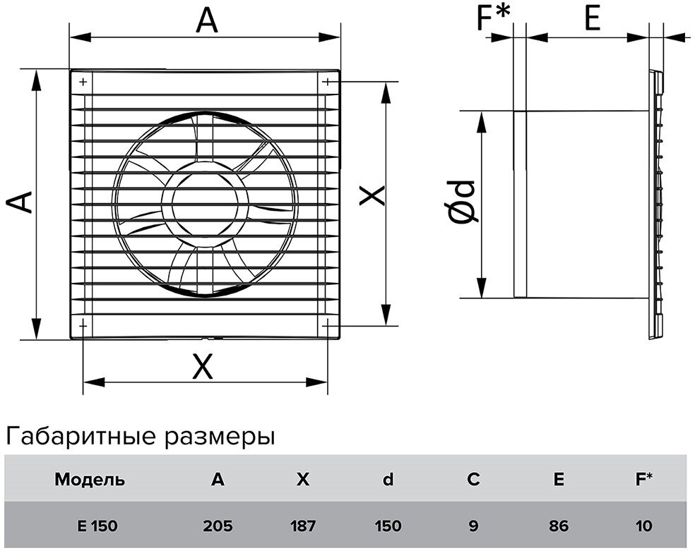 Вентилятор вытяжной ERA E 125 S, 180x180 мм, d=125 мм, 220‒240 В