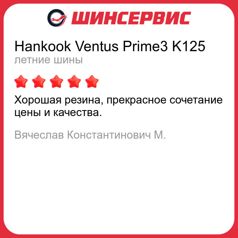 | Отзыв: | У всех людей разные требования к свойствам покрышек.Всегда искал комфортную резину,и всегда выходило компромиссное решение.Короче говоря,Hankook Tire Ventus Prime3 решает!!! |
