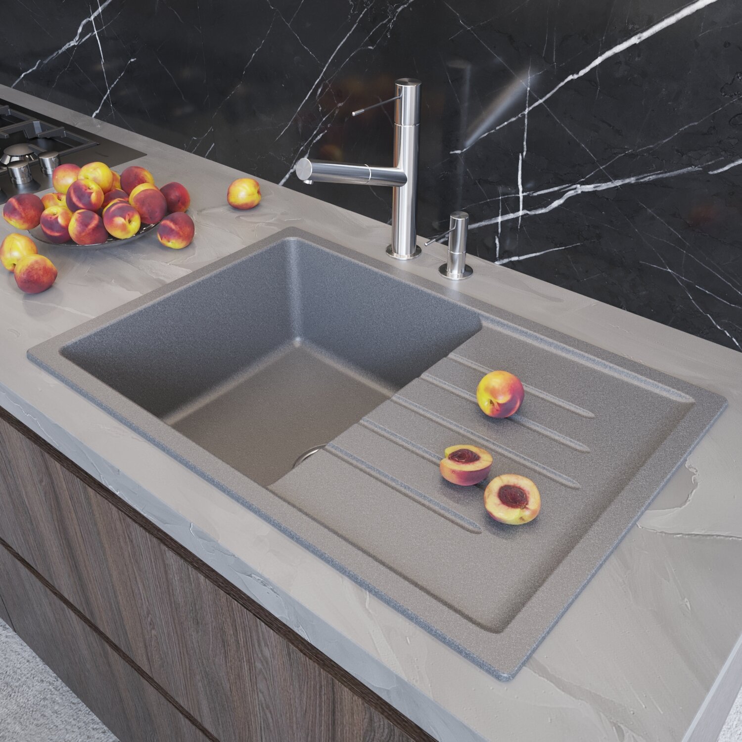 Мойка для кухни из искусственного мрамора 75х50, прямоугольная, с крылом, с сифоном, MIXLINE ML-GM 19, графит