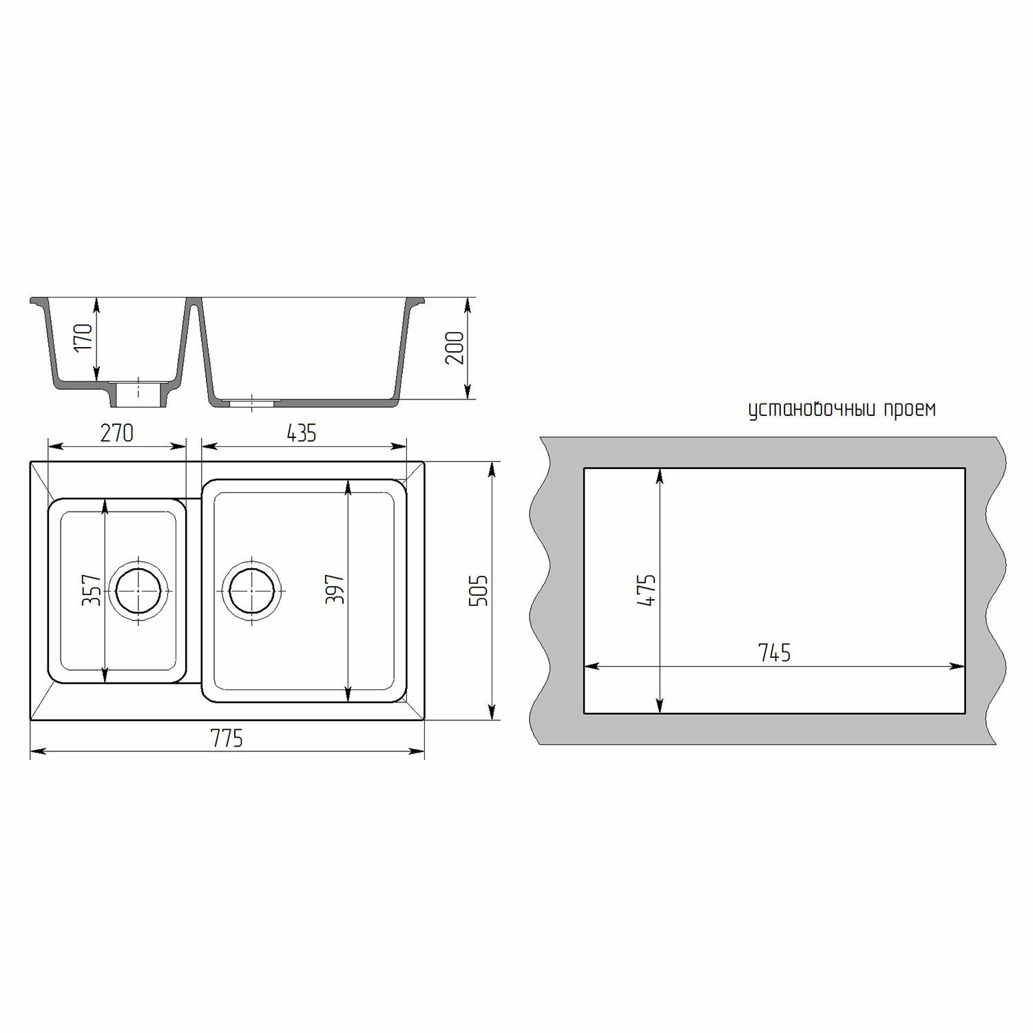 Мойка ML-GMS13 стандарт двухчашевая, темно-серый (309), 775*505*200мм