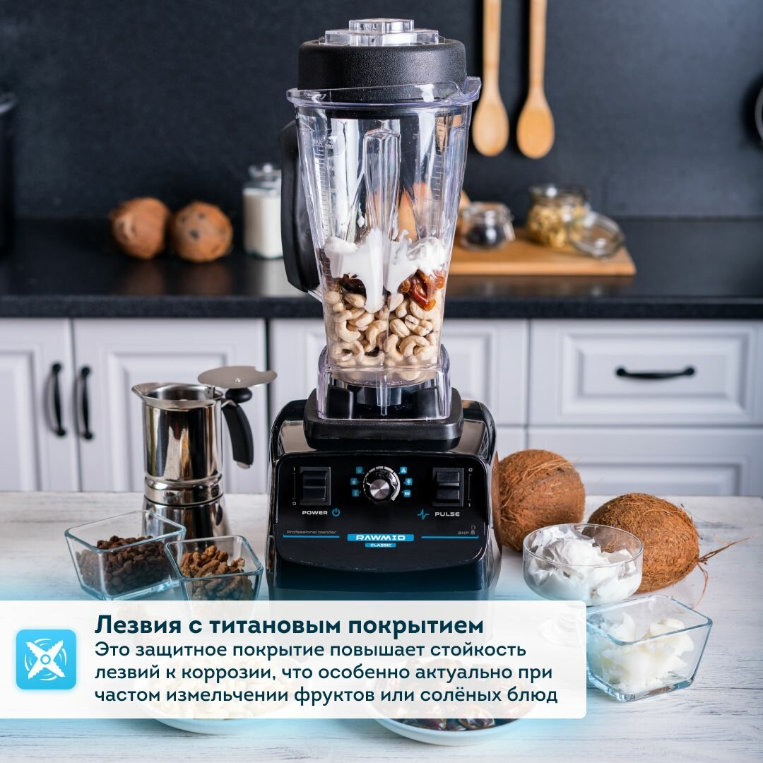 Стационарный блендер для смузи и коктейлей RAWMID Dream Classic BDC-03 BPA-FREE (цвет черный), профессиональный блендер. Расширенный комплект.
