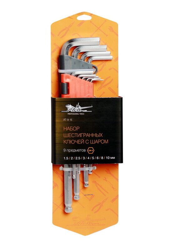 Набор шестигранных ключей удлинённых инбус с шаром 9 предметов (1.5 2 2.5 3 4 5 6 8 10мм) пласт.подв AIRLINE Артикул: at-9-15