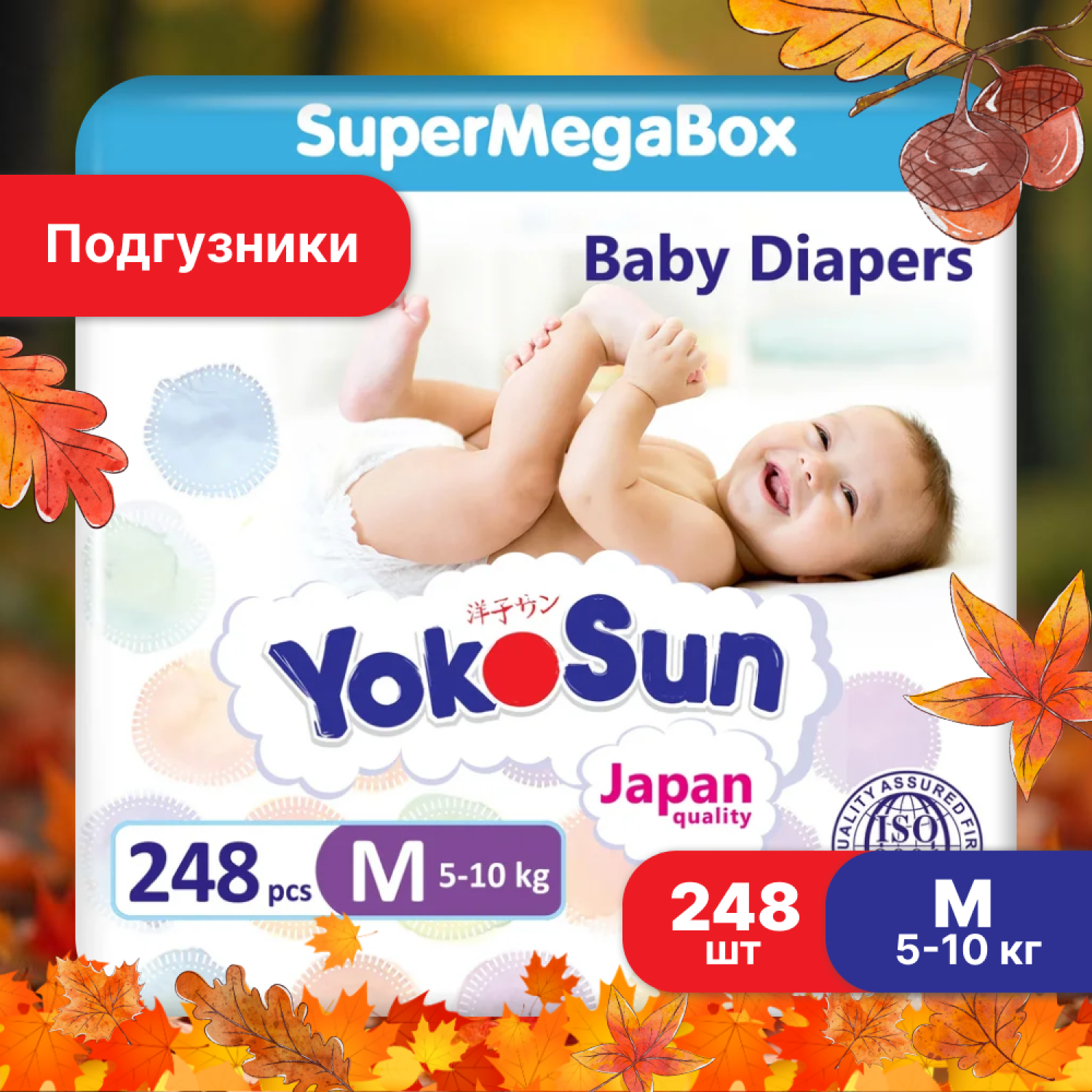 Подгузники YokoSun, 248 шт, размер M, (5-10 кг), (4 уп * 62 шт)