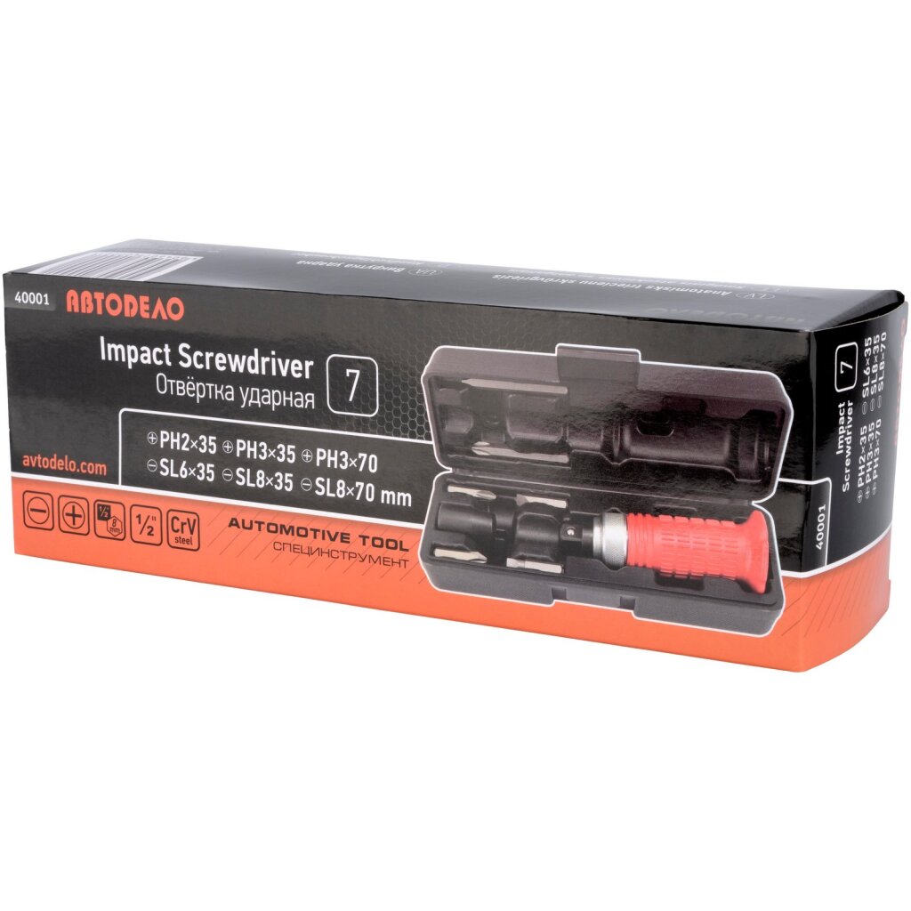 Отвертка ударная реверсивная со вставками (битами) Автодело, 6 насадок (SL6, SL8x2, PH2, PH3x2), переходник 1/2"→8мм, арт. АД-40001