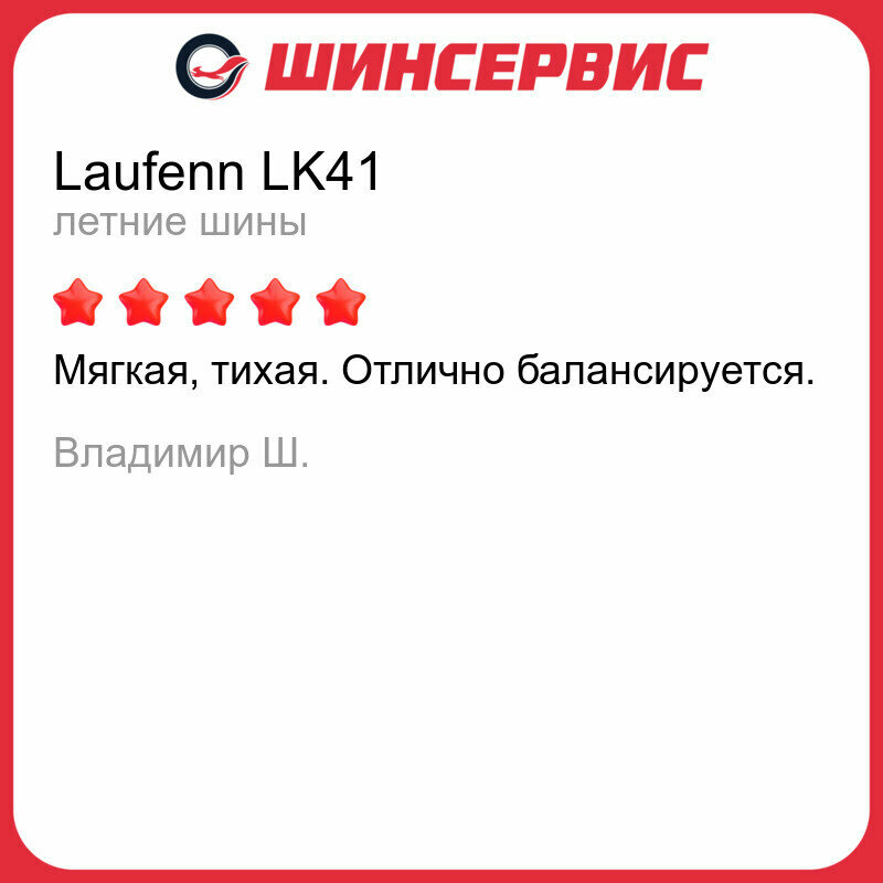 Авто как-будто преобразился. По крайней мере я решил подождать с его продажей. Как выяснилось многие его недостатки были связаны именно со старой изношенной резиной. Во-первых, что сразу отметил - шина реально очень тихая. На хорошем асфальте слышен только ветерок. На асфальте среднего качества, шум от колес появляется где-то на 40-50 км, и то это не такой шум, что у меня был на стоковых Бриджах. Второе, что отметил - это хорошее торможение, как на сухом, так и на мокром асфальте. Ни разу не приходилось, жать тормоз в пол, и ни разу ни сработала АБС, что бывало со старой резиной. В снег с дождем при +2 градуса - автомобиль ведет себя абсолютно предсказуемо, вождение не вызывает беспокойства. В лужи на скорости выше 50 км не заезжал. В-третьих - шина мягкая, стыки ямки и неровности стало гораздо приятнее проходить! В-четвертых прекрасно держит дорогу. В городе кольца, развязки на 50-60 км без потери траектории - легко! Никаких пробуксовок, даже если с педали в пол стартовать. На трассе комфортная скорость увеличилась на 10км, примерно. Сильно не гоняю, но если раньше 150 - это край, и лучше даже не пытаться (по нашим дорогам), и в среднем я езжу 120-130 по трассе, то сейчас могу себе позволить комфортно ехать 140, и без опаски притопить до 150-155. Ничего не могу сказать по износостойкости, и вряд-ли скажу, т.к. мой годовой пробег (и летний и зимний) редко превышает 10тыс км. Думаю, что к октябрю, с моим вождением, шина останется как новая. Конечно, я понимаю, что все что я пишу, это лишь в сравнении со старыми изношенными Bridgestone Dueler H/T, и, вполне вероятно, что многие шины "первого" эшелона, уделают Laufenn на раз-два, но эта шина полностью отрабатывает свои деньги и даже больше! Меньше 20 тыс за комплект 225/65/17 в начале сезона! |