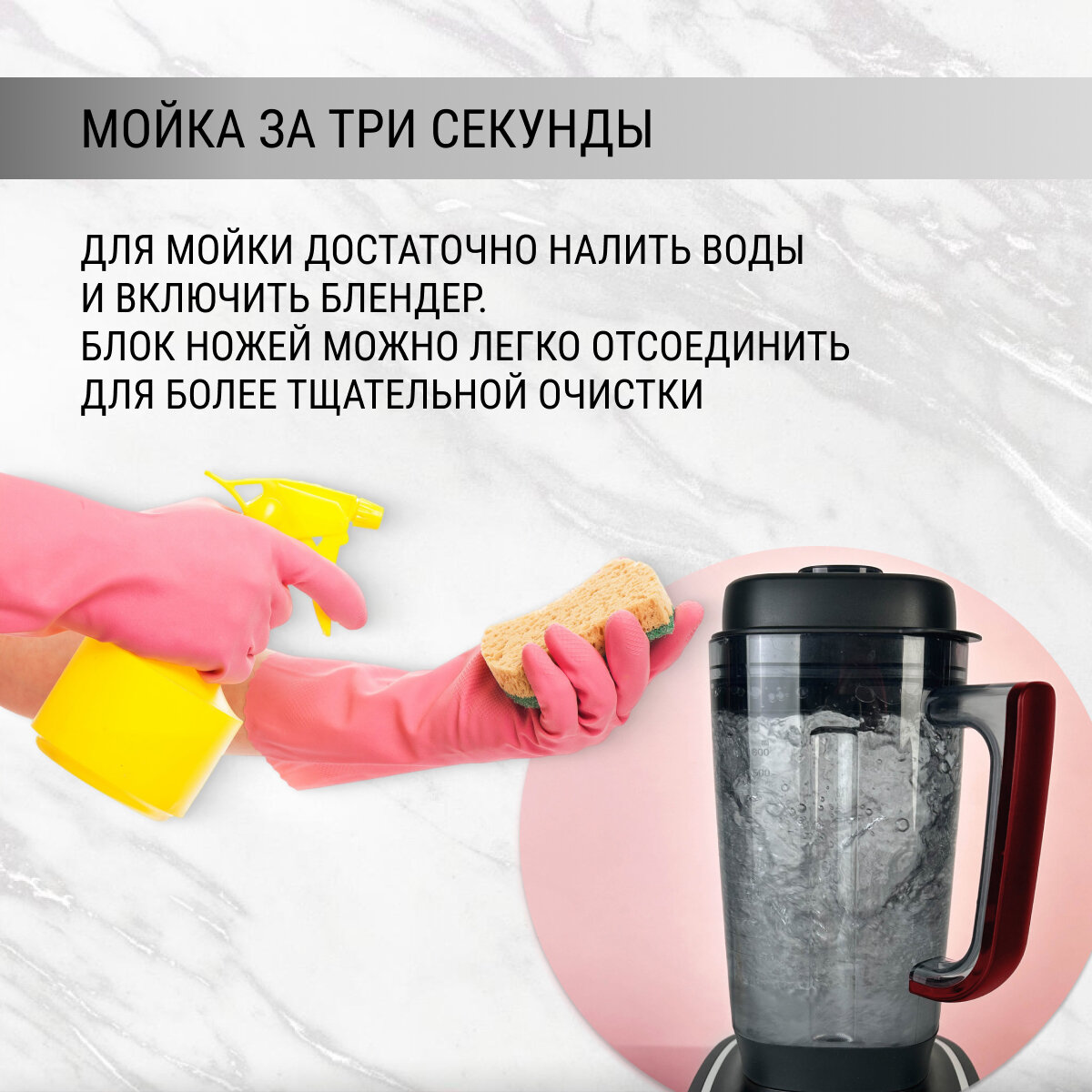 Помыть блендер очень просто. Ополоснуть и слить воду. Есть толкатель и крышка плотно закрывается. Ничего не выплескивается, хотя по вибрации на столе чувствуется вся его дикая мощь. В общем One Love!=)